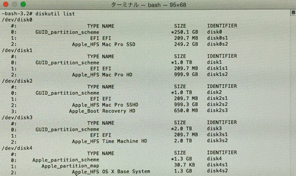 ディスクユーティリティ(GUI)でやる事を、ターミナル(CUI)でやるとこう成るって感じ・・・