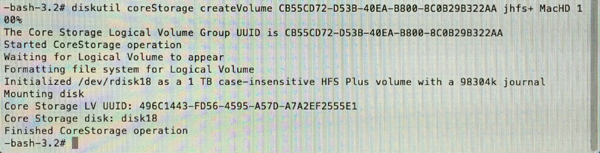 diskutil coreStorage createVolume CB55CD72-D53B-40EA-B800-BC0B29B322AA jhfs+ MacHD 100%