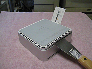 | Mac mini をひっくり返して、スクレイパーをグサリと差し込む。 テコの原理で少し浮かす。 |