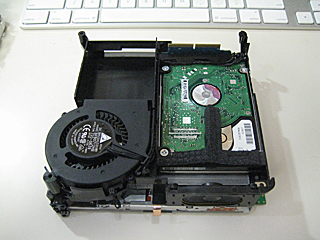 ドライブユニットをひっくり返すと、冷却ファンと HDD が現れる。 やっと目的地に辿り着きました。 |