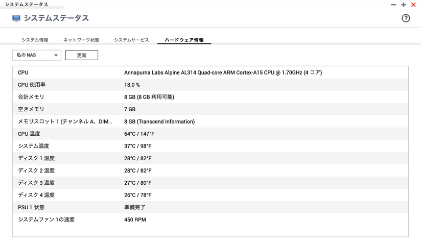 QNAP を起動して、システムステータスの「ハードウェア情報」で確認する。
