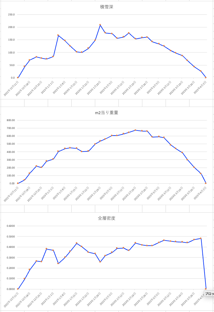2023年の積雪深・積雪重量・全層密度のピークは、以下の通り・・・