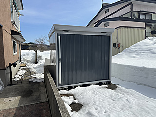 | イナバ物置の屋根に雪はありません。 気温と太陽光で物置内部が温められて、 地上よりも早く屋根の雪が融けます。 物置前にあった雪を除雪してスッキリしました。 イナバ物置の耐雪実験は終了です。 屋根雪 1.5m を見れなかったのが少々残念です。 |
