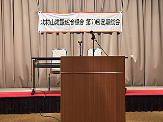 第70回 北村山建設総合組合 定期総会 演台の後ろ、ステージの上が議長・副議長席です。 |