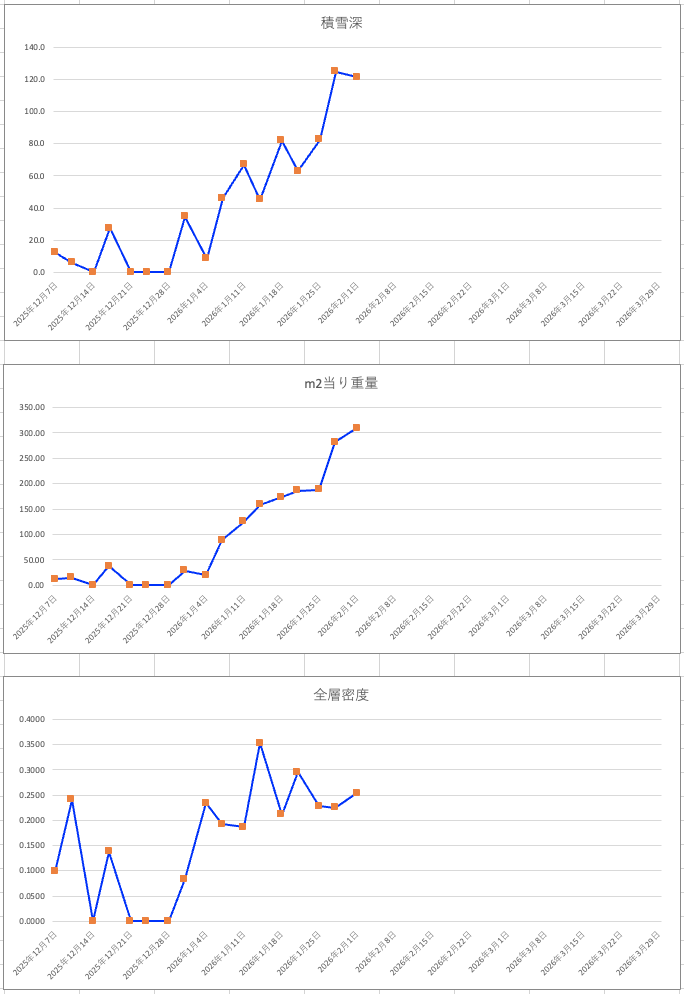 今シーズンの積雪・融雪データが溜まって来たので「積雪観測 2026」と「我が家の屋上融雪 2026」を纏めて置きました。