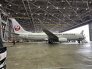 整備を終えた飛行機が M2 格納庫から出て行く所です。これは貴重だと JAL の人が言っていた。