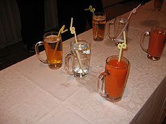 | 支部対抗ストロー早飲みリレー競争 ・1番走者(ビール) ・2番走者(酎ハイ) ・3番走者(スペシャルドリンク) 個人戦でなく支部対抗戦なのがイイね。 |