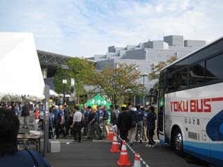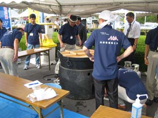 | 会場の外で山形県建築士会が「芋煮」を振る舞う。 芋煮チームの皆さん、ご苦労様です。 大きな鍋は、山形から持って来たのだろうか? |