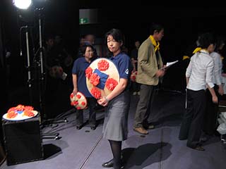 | 我々花笠踊りチームもステージ脇でスタンバイ 村山支部の草刈さん、私の笠踊りの師匠です。 花笠の大きさが、手踊りと笠踊りでは違う。 笠が小さいと笠踊りはし難いし、迫力も出ない。 |