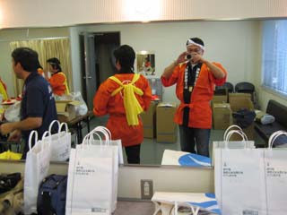 | 山形県建築士会・花笠踊りチームの控え室 こんな部屋を用意して頂き、徳島に感謝! 山形県建築士会は、揃いのポロシャツを着ています。 他の人が見ると異様な集団、それが山形です。 |
