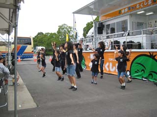 | 会場の外で昼食(弁当) ちびっ子ダンスチームの余興があった。 我々の花笠踊りよりもカッコイイかも・・・ |
