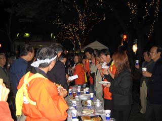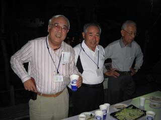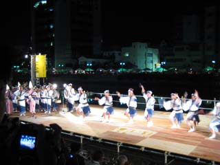| 懇親会会場:水際公園 屋外での懇親交流会です。ここでも踊りますよ。 徳島は山形と違って暖かい。夜でも半袖 OK です。 徳島の皆さん、雨が降らなくて良かったですねえ。 雨が降ったら最悪でしたよ。 |