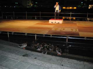 | 懇親会特設ステージ 川の上にパイプとコンパネで作っています。 何故か鴨が沢山いました。 ここで花笠踊り第 2弾!な訳ですよ・・・ |
