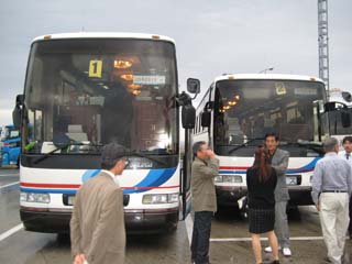 | 1号車(山形・天童支部) 2号車(村山・西村山・長井・米沢支部) 1号車はハイルーフで座席の位置も高い。なぜ? 酒田・鶴岡・最上支部は別ツアーです。 |