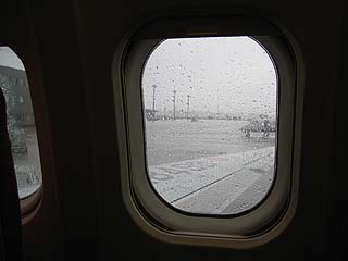 | 外は生憎の雨降りです。 iPhone は「機内モード」にしましょう。 飛行中、飛行機がかな〜り揺れた様です。 私はず〜っと寝てましたけど・・・ |