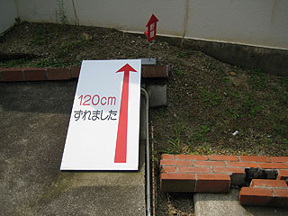 | 北淡町震災記念公園 震災の時の断層が、そのまま保存されています。 矢印の分だけ地盤がズレました。 |