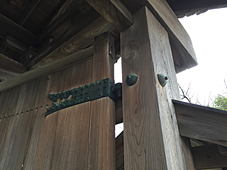 | 致道館の門の扉の金物 金物を柱に貫通させて、更に抜け止め金物な訳ね。 |