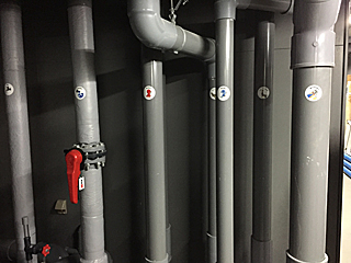 | 各水槽やプールへの配管 行き先が判る様に動物のシールが貼ってあった。 海水なので、鋼管でなく塩ビ管が基本の様です。 オープンして半年、既に錆が発生している所もあるらしい。 |