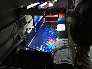 | イワシの群れの上 イワシが飛び出ない様に、網を掛けてある。 |