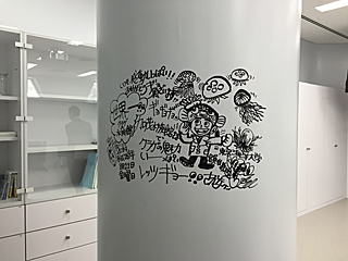 | 魚類学者でタレントの「さかなクン」 柱の落書き?は、さかなクンが来た時のサインらしい。 |