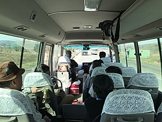 朝 8時、新潟へ向かって GO! 20人乗りくらいのバスに、参加者 9名でゆるゆるです。 ドタキャンが一人出たが、まあ仕方あるまい。 |