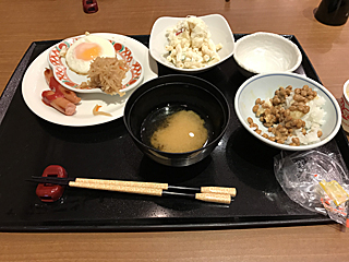 ホテルの朝食 妙に納豆ごはんが食べたく成って、和食テイストです。 この後、クロワッサンとコーヒーで締めました。 |