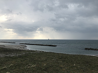 日本海の荒波・・・? 今日は割と凪(なぎ)ですね。 帰りのバスはいつもは静かなのだが、今回はゲラゲラ五月蝿い。 皆さん楽しかったのか、元気が有り余っているのか? 私は日本海を見ながら、ビールをちびりちびりと飲む。 |