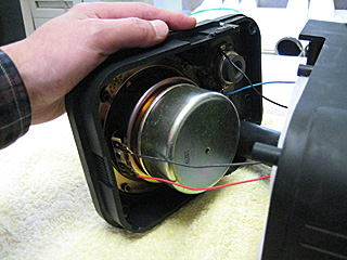 バッフルを外したら、配線の位置を忘れない様に・・・ 指先が真っ赤ですね。それだけ苦労したんです。 |
