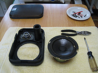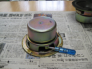 バッフルからスピーカーユニットを外す。 正面のネジをプラスドライバーで外すのだが、 内側の六角ナットをペンチで抑えないと空回りする。 まあ、やってみれば判ります。 |