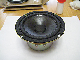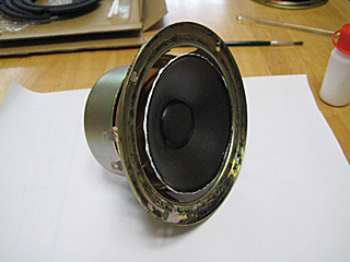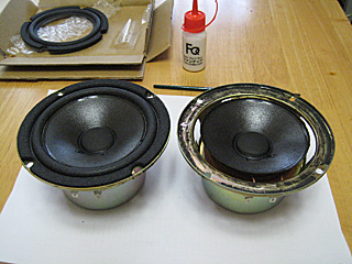 1つ目のエッジ交換を終え、2つ目のエッジ交換も終えた頃、 1つ目のボンドの乾きがイイ感じに成っている。 逆の工程で、1つ目のスピーカーを組立てる。 引き続き、2つ目のスピーカーも組立てる。 |