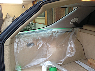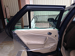 | 後部座席の左右を貼り終える。 カット済みだと、フィルム貼りが実に楽チンだねえ。 |