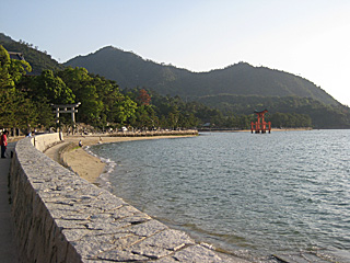 向こうに見える赤いのが、厳島神社の鳥居です。