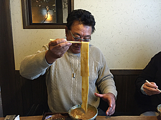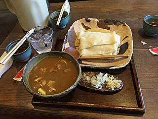 | こんな感じで、カレー汁に付けて食べる。 このうどんって、どうなんでしょう? 味はカレーうどんでしょうが、食べ易いとは言えませんね。 |