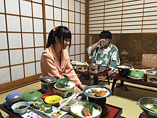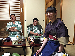 | 我々担当の中居さんと三浦さん 若くて綺麗な中居さんだったので大感激である。 お茶を入れて貰い、旅館の説明を受ける。 部屋が 8帖と 12帖の二間続きで、なかなか広い。 |