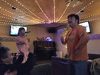 | 誰かがカラオケを歌えば、寺ちゃんが黙っていない。 曲は勿論、AKB48 の「恋するフォーチュンクッキー」だ。 すっかり寺ちゃんの十八番に成りましたねえ。 |