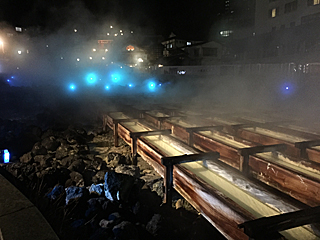 | 湯畑の最後(滝になって落ちる所) 夜の湯畑も良かったが、朝の湯畑も悪くない。 |