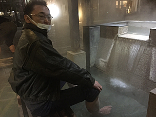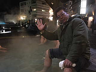 | 足湯でくつろぐ三浦さん 三浦さんは温泉が大好きで、全国各地の温泉にも詳しい。 左官組合の温泉案内人でもある。 |
