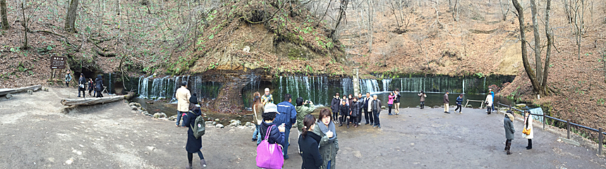 白糸の滝をパノラマで撮るとこんな感じ・・・、粘土層の上の軽石層から地下水が流れ出ている。
