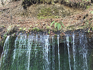 | 岩の間から地下水が白糸の様に流れ落ちる。 神秘的で、実に美しい滝と言える。 崖が緑の草の時期や、紅葉の季節だったら更に良かったね。 |