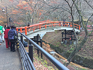 | 伊香保神社の奥に、朱塗りの太鼓橋「河鹿橋」がある。 更に奥には、伊香保温泉の第二源泉と露天風呂があった。 入ってみたい気もしたが、寒いし、タオルを持って来てないし、 帰って旅館の温泉に入りましょう。 |