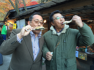 | 帰り道、鮎の塩焼きを頬張る青木さんと三浦さん この二人は、何か物凄く似た者同士って感じがする。 |