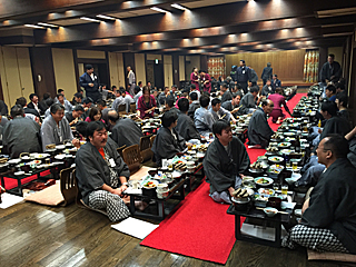 | 日左連青年部 左官サミット「群馬」開宴! サミットと言う名の、単なる忘年会です。 参加者は全国から 100名くらい? そして山形チームは、中締めをする前に二次会へと消える・・・ |