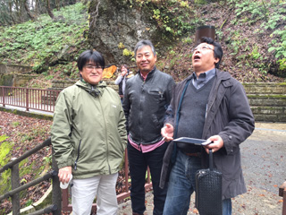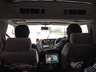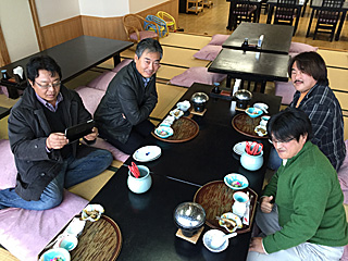 三浦さんが、旅の写真(iPad)を浄土さんに見せていた。 我々の腹出し姿を見せられて、浄土さんも笑うしかあるまい。 |