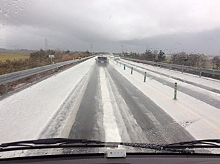 新潟県に入った所で道路が雪だった。 こんな感じで、道路にかなり積もっております。 今年の初雪は新潟で見ましたよ。 [Photo by Miura] |