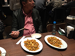 お好み焼き(いか、ぶた、えび、キムチ)と、 焼きそば(いか、ぶた、えび)を注文する。 最初に焼きそばが来た。焼きそばは出るのが早い。 |