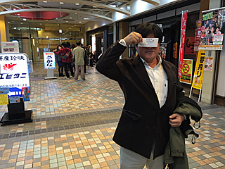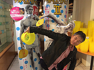 ケロリンの風呂桶を持ってポーズする大類さん 後ろのテルマエロマエ II の真似です。 ケロリングッズが沢山売っていた。 ケロリングッズは「アマゾン」でも買えます。 [Photo by Miura] |
