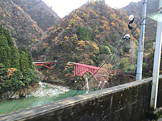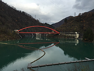 宇奈月ダムの湖面橋 昔は山と川だった所にダムを造ったら、湖に成りました。 |