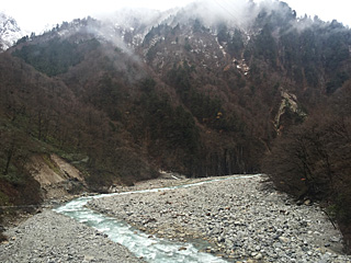 何だか河原が荒々しく成って来た。山も白く成って来た。 普通客車(オープン型)の連中は、大丈夫だろうか? |