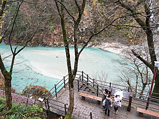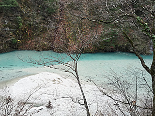 おや?下の川まで下りて行ける様だ。 鐘釣河原には「河原露天風呂」があるらしい。 だが、帰りの電車が来るまで 20分しかないのだよ。 今回の所は諦めよう。って次はいつ来るんだ? |