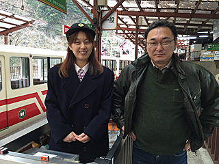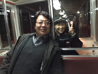降る途中、下り(登り)の電車との交換待ち 車掌の浄土さんと記念撮影をする。 すっかり仲良しに成っても、流石に腹は出しません。 |